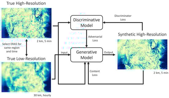 Super-resolution leverages deep convolutional networks with various model architectures, such as UNets, CNNs, and GANs [36,37,38,39]. GANs, in particular, have demonstrated superior performance over these standard regression models in generating more realistic spatial structures [40,41]. This previous work on super-resolution has relied on the assumption that coarsened or averaged, high-resolution data are a good approximation for low-resolution data [37,40,42,43,44]. We previously used GANs trained in this way to downscale wind data over Southeast Asia [45]. While this assumption can lead to excellent results, our approach instead uses low-resolution European Centre for Medium-Range Weather Forecasting Reanalysis v5 (ERA5) input data paired with high-resolution dynamical downscaling outputs as target data. We also include multiple low-resolution variables in training, which are not super-resolved, solely to better inform the enhancement of the high-resolution outputs and improve model generalization. This aligns with the process of dynamical downscaling, which uses multiple variables from low-resolution simulation output as boundary conditions for high-resolution simulations. We show that by training with separate low-resolution and high-resolution simulation data in this way, we achieved performance comparable to dynamical downscaling.