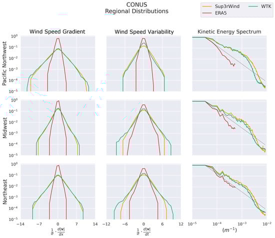 Wind speed (100 m AGL) distribution comparisons between ERA5, Sup3rWind, and original WTK across all validation regions. Columns from left to right: probability distribution of longitudinal wind speed gradient, probability distribution of wind speed time derivative, and normalized turbulent kinetic energy spectrum. The dashed line in the kinetic energy plots follows the Kolmogorov scaling law.