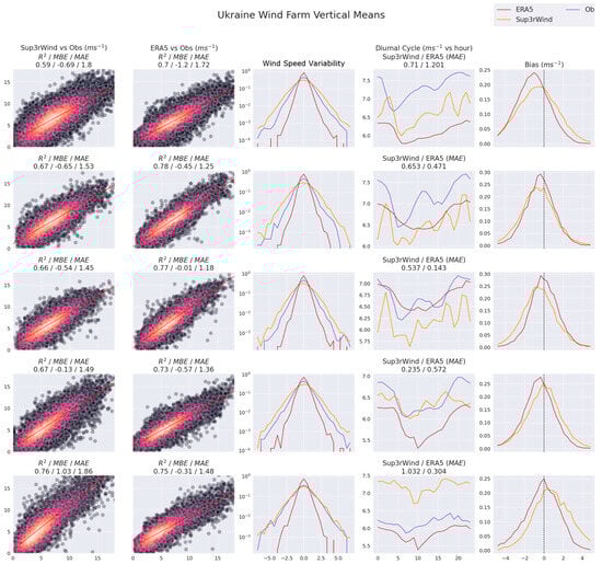 Summary of Sup3rWind performance against Ukraine vertically averaged wind farm observations. Columns from left to right: Sup3rWind vs. observation point cloud, ERA5 vs. observation point cloud, probability distribution of the wind speed variability, diurnal cycle, and bias distribution. Wind Farms A–E from top to bottom row. Coefficient of determination (), MAE, and MBE are shown above each scatterplot. MAE of the diurnal cycle is shown above each diurnal cycle plot. The color scheme in the scatter plots is used to show density. The dashed vertical line in the bias distribution plots is positioned at zero bias.