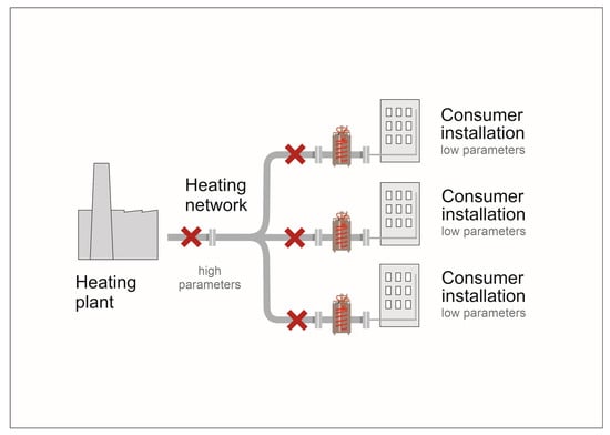 Upon disconnecting a building’s heat exchange station from the central district heating network, the heat supply is taken over by on-site heat pumps and induction boilers, supported by local (distributed) heat storage systems, as shown on Figure 1, where red crosses symbolize disconnected part of network.