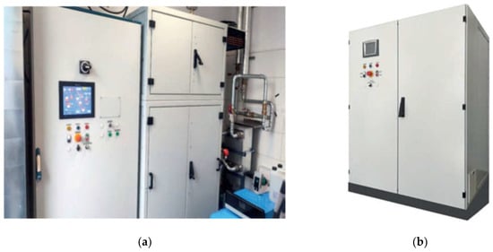 100 kW induction boiler: (a) induction boiler in the heating center of Energo-Complex company; and (b) general view of the induction boiler.