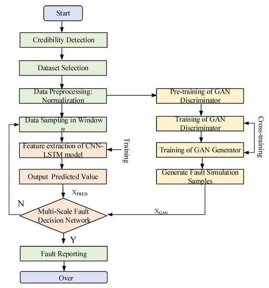 The sampled data is subsequently input into the CNN-LSTM network for accurate prediction, and the GAN is utilized to generate new samples with statistical characteristics similar to real fault data for data augmentation. Finally, in order to grasp the global features of the detection data and make fault evaluation more accurate, a multi-scale deep neural network (DNN) model is designed to extract and classify the features of the data predicted by the CNN-LSTM network, so as to determine whether there is fault data in the predicted data and output the fault identification results accordingly. If there is no fault, the sampling window is returned to continue predicting and inspecting the next batch of data.