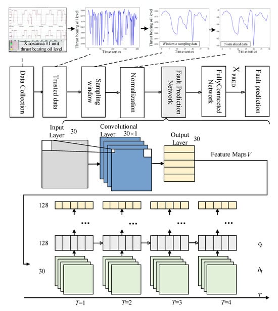 The data are normalized as a preprocessing step. The structure of this prediction model is provided in Figure 2. This model possesses the advantages of both a CNN and LSTM, extracting features from the monitoring data and using a gating mechanism to control the transmission state, thereby maintaining long-term memory of certain features. The network structure mainly consists of CNN layers, LSTM layers, and fully connected layers. The network’s input dimension, represented by the window size n, is configured as 30. This indicates that the model utilizes historical data from the past 30 time steps to predict the value at the subsequent () time step. Given the 2 min sampling interval, this window size corresponds to 1 hour of temporal coverage. This parameter selection achieves an optimal balance between capturing meaningful temporal patterns and maintaining computational efficiency by preventing oversampling-induced redundancy [31].