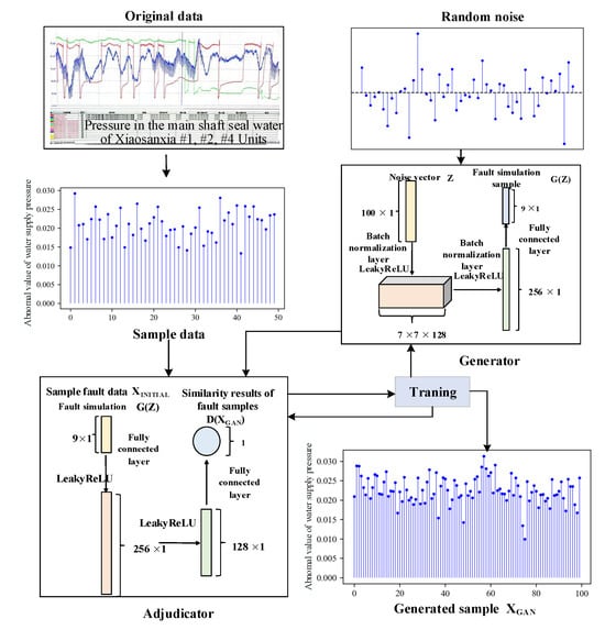 On the other hand, the equipment of hydropower stations is usually designed with a large safety margin, which leads to a severely imbalanced distribution of actual fault data compared with normal data. In this situation, it is particularly difficult to extract fault features and conduct effective detection. Although meta-learning [27] and contrastive learning [28] are capable of improving the model’s generalization performance for new tasks, their high complexity may lead to overfitting in new tasks, thus affecting the expected performance of the model. In addition, this type of method has limitations in generalization ability. Even after training, the model may demand a large volume of new task data to attain the desired performance. In this situation, the generative adversarial network (GAN) [29], which was originally used for image processing, has gradually been discovered to have the potential to expand samples. It does not have to consider the adaptability of the model to small sample data. Instead, by simulating the data generation process, it directly creates new samples that are extremely similar to the real fault data in statistical features, thus enriching the fault sample library and providing more data support for the training of the fault detection model.