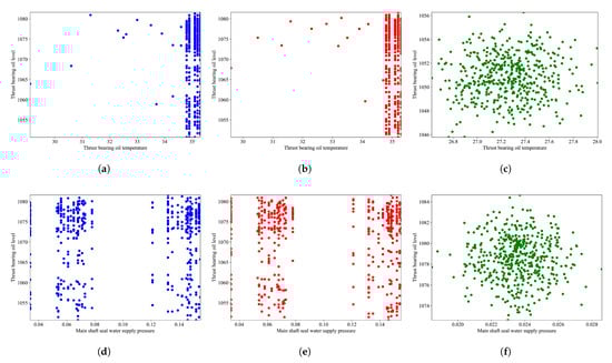 It is of vital importance to conduct a credibility check on the data before selecting data. Due to the limitations of environmental factors and the stability of monitoring equipment, certain data may contain errors and deviate from the range of most normal data. As shown in Figure 5, scatter plots of the monitoring data of oil temperature in the oil tank, water pressure, and oil level in the tank are presented. Figure 5a,b,d,e show the scatter distribution of normal monitoring data, while Figure 5c,f show the scatter distribution of erroneous data. It can be clearly observed that the concentration trend of abnormal data is different from that of normal data.