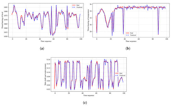 Prediction results of the CNN-LSTM model. (a) Thrust bearing oil level. (b) Thrust bearing oil temperature. (c) Main shaft seal water pressure.