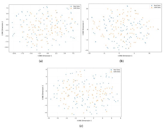 Figure 7 shows a t-SNE visualization of the real and GAN data in the features (t-SNE, dimension 1; t-SNE, dimension 2) after dimensionality reduction. The highly mixed distribution of real (blue) and generated (yellow) data points demonstrates that the GAN successfully captured the essential distribution characteristics of real data. The absence of clearly separated clusters in t-SNE space indicates strong global similarity between generated and real data distributions.