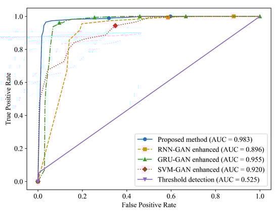 From Table 6, it can be seen that this scheme demonstrates the highest model robustness and can effectively adapt to complex and variable environmental characteristics as well as diverse data distribution characteristics. The detection performance of our method has been improved by , , , and , respectively, compared with the RNN, GRU, SVM, and threshold detection algorithms. Compared with this scheme, although the RNN scheme can capture the dependency of time series in some cases, its training process is slow and prone to gradient vanishing and explosion, thereby affecting the stability and accuracy of the model. The GRU scheme, although solving the gradient vanishing problem of the RNN to some extent and improving the training efficiency of the model, still has the problem of insufficient modeling ability for long-term time series data, resulting in poor performance in complex tasks. The SVM scheme struggles to capture time dependence and long-term patterns and is not directly applicable to time series tasks, and its decision boundary is fixed, making it difficult to dynamically adjust with new data after training, and it has poor flexibility. Traditional threshold setting and weight-based fault detection methods often rely on expert experience, which may struggle with meeting the actual requirements in terms of the detection effect and efficiency when dealing with multiple abnormal patterns.