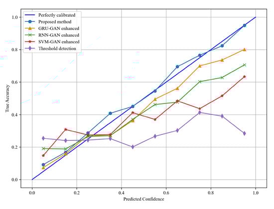 To evaluate the comprehensive performance of the proposed detection method more scientifically, the average receiver operating characteristic (ROC) curve of each scheme is illustrated in Figure 8, from which we see that the proposed scheme is significantly superior to other schemes and is higher than other schemes in most false positive rate intervals, indicating that the model has a stronger ability to distinguish positive cases from negative cases. Figure 9 presents the reliability diagrams of different methods. The proposed method is close to the diagonal line, outperforming the other methods.