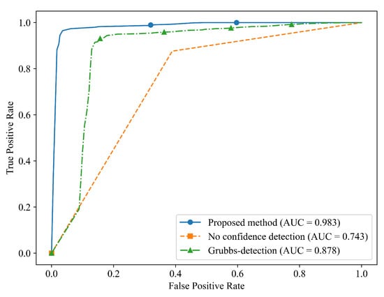 Figure 10 presents a comparison of ROC curves between PCA-based methods with and without the reliability detection mechanism, as well as a comparison with the Grubbs’ test for outlier detection. The Grubbs’ test method can identify anomalies to some extent but performs less effectively than PCA-based anomaly detection. The Grubbs’ test analyzes each variable independently for outlier detection in a multivariate context. Its advantages lie in computational efficiency, so it is particularly suitable for data with weakly correlated features. However, this method has significant limitations: it fails to account for interdependencies among variables, potentially missing complex anomaly patterns that require multivariate joint determination (e.g., combined anomalies where multiple features exhibit slight deviations simultaneously), and it suffers from computational redundancy in high-dimensional data. In contrast, PCA-based anomaly detection enables multivariate collaborative evaluation through principal component contribution analysis. It automatically captures intrinsic correlations among variables, and its contribution-based ranking mechanism prioritizes high-quality samples that align with the primary data patterns. This approach is particularly effective for high-dimensional industrial monitoring data with strong correlations, as its mathematical framework inherently supports the detection of multivariate joint anomalies.