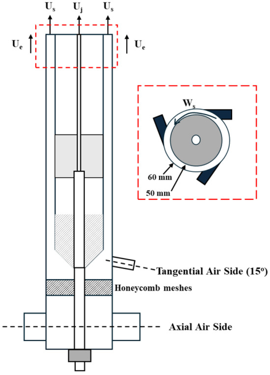 A schematic representation of the burner used in these investigations is provided in Figure 1. Swirl is aerodynamically induced into the primary (axial) air stream 300 mm upstream of the burner exit. This process is achieved through three tangential air swirl ports, each with a diameter of 7 mm, positioned circumferentially at 120° intervals and inclined 15° upward relative to the horizontal plane. Additionally, two diametrically opposed ports, located upstream of the tangential inlets and along the burner periphery, supply the axial air streams. This design ensures a relatively simple configuration with well-defined and uniform boundary conditions, making it suitable for experimental and computational studies [26].