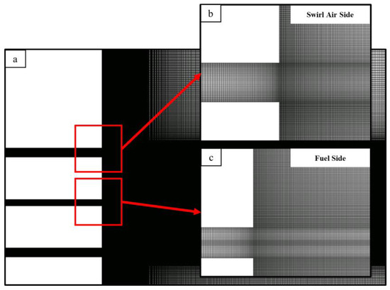 Numerical mesh definition of the computational domain (a). Enlarged view of Swirl Air Side (b), Enlarged view of Fuel Side (c).