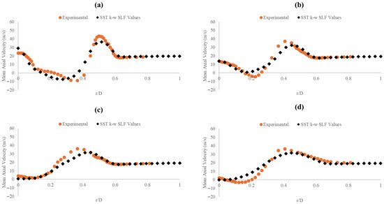 Comparison of axial velocities experimental data with CFD results using SST k-w turbulence and SLF combustion modeling (a) x/D = 0.4, (b) x/D = 0.8, (c) x/D = 1.2, and (d) x/D = 2.0.