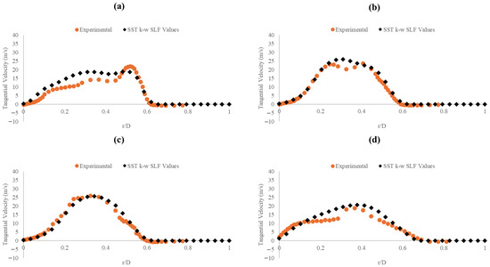 Comparison of tangential velocities experimental data with CFD results using SST k-w turbulence and SLF combustion modeling (a) x/D = 0.4, (b) x/D = 0.8, (c) x/D = 1.2, and (d) x/D = 2.0.