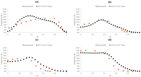 Comparison of temperature experimental data with CFD results using SST k-w turbulence and SLF combustion modeling (a) x/D = 0.4, (b) x/D = 0.8, (c) x/D = 1.0, and (d) x/D = 1.5.