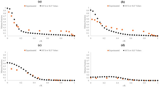 Comparison of mixture fraction experimental data with CFD results using k-w SST turbulence and SLF combustion modeling (a) x/D = 0.2, (b) x/D = 0.4, (c) x/D = 0.8, and (d) x/D = 1.5.