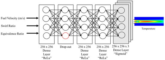 The first approach employs a fully connected dense neural network that maps scalar input parameters—fuel velocity, swirl ratio, and equivalence ratio—directly to temperature contour images. This model is trained on labeled CFD data, enabling temperature field prediction based solely on these physical input variables.