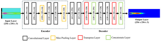 Li et al. introduced a U-Net architecture for forecasting temperature and CO2 concentration distributions in flames. This approach provides multiple significant benefits for the reconstruction of flame scalar fields. Initially, it necessitates solely spectral data obtained along the axial centerline of the flame, so considerably diminishing the requirement for comprehensive experimental observations. Second, prior knowledge of flame characteristics can be effectively incorporated into the training dataset, allowing the U-Net to achieve high reconstruction accuracy through offline training. Finally, the U-Net performs direct image-to-image mapping between the measured spectral optical thickness and the two-dimensional scalar fields of the flame, preserving spatial continuity more effectively than traditional line-of-sight reconstruction methods. These features demonstrate the U-Net’s strong capability as a reliable tool for flame reconstruction [19].