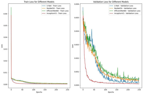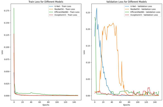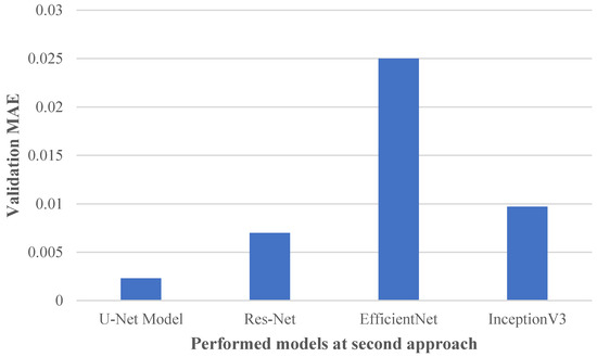 Figure 25 presents the validation MAE results. The maximum value is observed in the Efficient Net model, consistent with the initial method. The U-Net model has the lowest value. This score signifies the efficacy of the U-Net model in segmentation tasks. Res-Net exhibits a somewhat elevated error value; however, it does not demonstrate a substantial disparity in forecasting flame behavior and high-temperature areas. Due to its multi-layered architecture, Inception V3 can process the dataset at a specific scale. Efficient Net exhibits a decline in performance during dataset training due to overgeneralization.