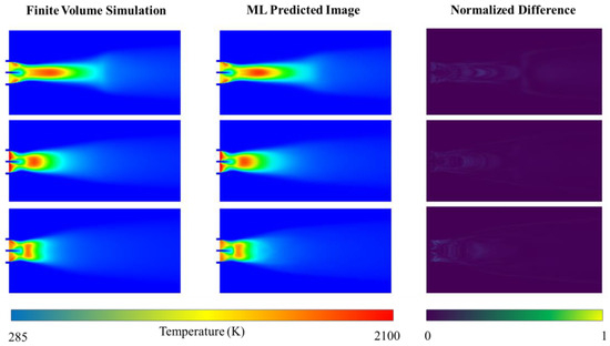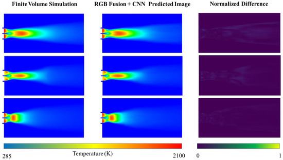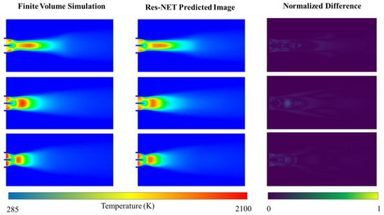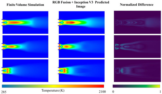 Figure 22 presents a comparison between finite volume and anticipated images generated by the Inception V3 model. The model’s performance exhibits findings comparable to those of Res-Net and U-Net. Nonetheless, the normalized difference values were determined to be superior to those of the images generated using U-Net and Res-Net. However, this discrepancy did not result in a significant margin of error in identifying the flame’s high-temperature areas.