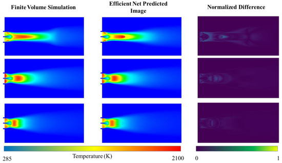 Figure 20 illustrates that the Res-Net model yielded performance results comparable to those of the U-Net model. The Res-Net model can accurately anticipate flame behavior and high-temperature zones. Figure 21 reveals substantial discrepancies between the anticipated and real photos for EfficientNetB0, indicating that the flame behavior was inaccurately forecasted in some instances.