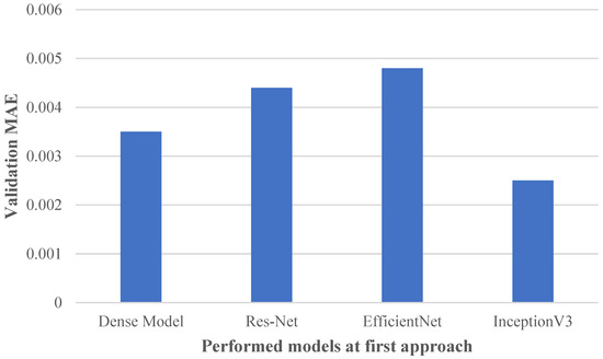 The performances of the two developed approaches were systematically compared in terms of training efficiency, model size, and predictive accuracy. In total, four ANN methods were performed at each approach. Validation MAE errors are given in Figure 23 for the first approach. The initial analysis reveals that the Inception V3 model has the lowest validation MAE value. The Efficient Net model exhibited the highest error rate. The Inception model operates by integrating multi-layered and multi-scale architecture. This enables the model to concurrently learn features at various resolutions. While the Efficient Net model reflects the overall characteristics of the flame, distortions have emerged at the contour boundaries.