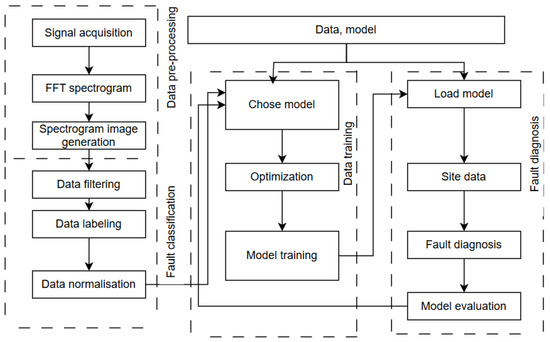 The fault classification phase is closely integrated with pre-processing and involves organizing the labeled and normalized spectrogram data for input into the convolutional neural network (CNN). As a data-driven system, the accuracy and reliability of the diagnostic model heavily depend on the quality of this pre-processed input.