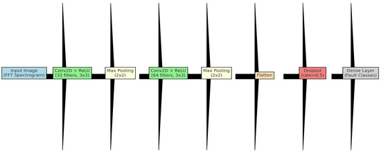 Max pooling is employed after each convolutional layer using a 2 × 2 filter. This operation reduces the spatial dimensions of the feature maps by selecting the maximum activation within each pooling window. By preserving the most salient spatial features while discarding redundant or less informative activations, max pooling helps reduce the computational load and enhances the network’s robustness to small shifts or distortions in the spectrogram input. The two-stage convolutional-pooling sequence enables the progressive abstraction of frequency–temporal patterns associated with specific fault types.