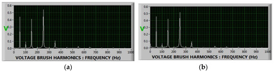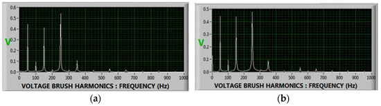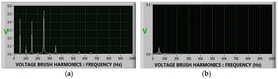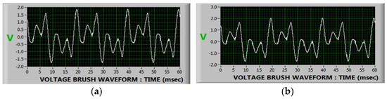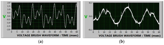 Shaft voltage and current measurements were carried out using a standardized setup, as illustrated in Figure 1. At the non-drive end (NDE) of the shaft, a high-impedance voltage brush was installed to sense the shaft’s electrical potential relative to ground. Simultaneously, a current-carrying brush was positioned at the drive end (DE), forming a low-impedance connection to ground via a precision shunt resistor (0.0496 Ω, rated at 150 A and 1100 W). The resulting voltage drop across the shunt was used to calculate the shaft grounding current. This arrangement provided effective grounding through the DE brush while enabling the concurrent acquisition of both voltage and current waveforms. Outputs from the voltage-sensing circuit and the shunt resistor were routed to a data acquisition system for synchronized waveform recording. A typical shaft earthing system comprises two main components: