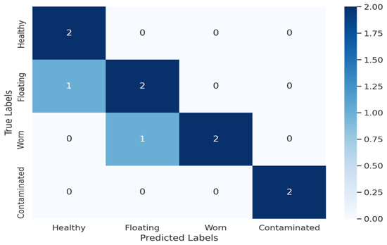 These minor confusions likely reflect overlapping time–frequency patterns, such as intermittent conduction, fluctuating currents, and harmonic distortions. Importantly, contaminated brush faults were identified with 100% accuracy, and no healthy conditions were misclassified as faults crucial for avoiding false alarms.