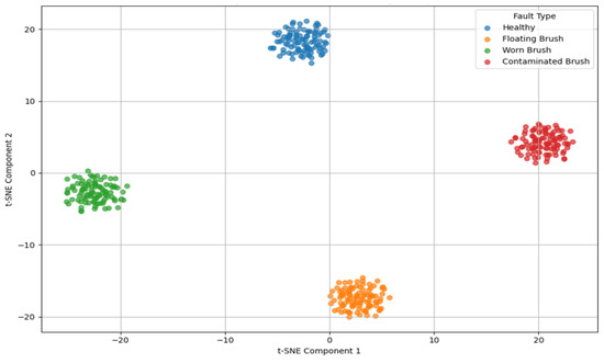 This plot in Figure 21 shows the clustering behavior of features extracted from the final convolutional layer. Different fault types, such as healthy, floating brush, worn brush, and contaminated brush, exhibit partial separability. While some overlap exists, the clear grouping of “floating” and “contaminated” classes suggests that the CNN captures meaningful discriminatory features.