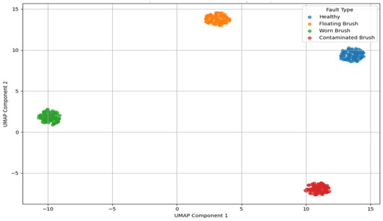 To enhance the interpretability of the CNN-based fault diagnosis model and address its “black-box” nature, dimensionality reduction techniques such as t-distributed Stochastic Neighbor Embedding (t-SNE) and Uniform Manifold Approximation and Projection (UMAP) were employed. These techniques enable the visualization of high-dimensional feature spaces in two dimensions, offering intuitive insights into how the CNN internally organizes learned representations to distinguish between shaft earthing brush fault types.