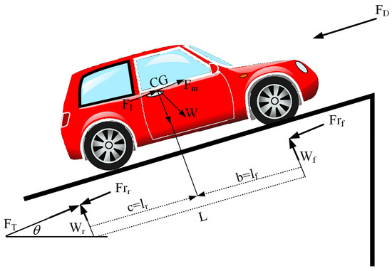 where specifies the drag coefficient, specifies the speed of the vehicle, represents the air density, and represents the car’s cross-sectional image within the speed direction. The second one represents rolling resistance, which affects the force needed to move the vehicle. This can be formulated as follows: