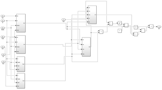 The goal of retiring a photovoltaic (PV) system autonomously with an EV is to enable the EV with a sustainable and reliable power source to improve the overall performance and independence of the EV. Solar panels are the basic elements of a PV system (utilizing the PV effect, converting light to electrical energy). This electricity is saved in energy storage batteries, which power the engine of the EV and other electric parts. Solar PV panels consist of some solar cells that produce this electricity by generating a small voltage and current when exposed to sunlight. The resulting output of these cells is a volt and current usable to charge the batteries [15]. Figure 3 shows the simulated system of PV.