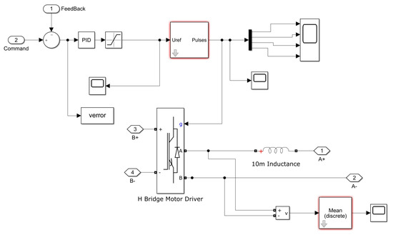 Informally, the rod diagram of the PID controller connects with the motor through PWM to optimize the current–voltage control, where A is for the H-bridge input and B is for the output. That is referred to as A-H, where A refers to the digital PWM signal produced from the PID controller, which sets the duty cycle to regulate the average voltage fed into the motor via the controlled switching sequence of those H-bridge transistors; the signal operates at such a high frequency to feed the motor, smoothen out the motor’s operation, and reduce any resultant noise. The signal B represents the actual pulsating DC voltage waveform fed to the motor after the modulation performed by the H-bridge that drastically influences motors in terms of speed and torque, ensuring that under different load conditions, the motor receives controlled power for the application and withstanding efficient and stable operation [20]. This configuration allows the IPO-optimized PID controller to vary the duty cycle with hostile feedback so that it vigilantly controls the voltage and is robust to disturbances like changes in temperature and driving cycles.