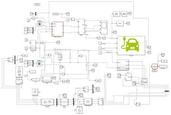 An interface of the two components is the DC–DC converter and inverter, whether with the motor’s power requirements [21]. This is to create a single and efficient architecture that will utilize energy for multiple activities, minimize reliance on the grid, and improve both stability and response of the EV under dynamic load changes [22]. Wind, solar, and other renewable energy sources have become more popular for electricity production in recent years. PV cells convert sunlight into electricity. PV panels directly generate electricity. Photoelectricity is the basis of this technology. Thin semiconductor layers form PV cells. When light hits the crystal, its electrons generate a potential difference between the cell’s upper and bottom sides. Solar panels are constructed of solar cells joined together.