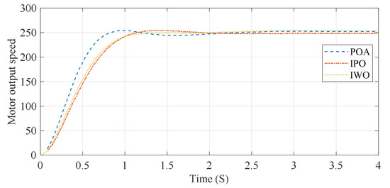 To enhance the efficiency of the DC motor, the new PWM control strategy is integrated with the IPO algorithm. The IPO models are used to optimize the PID controller’s parameters (, , ). The optimization is to minimize an objective function related to the control performance index, such as steady-state error, overshoot, and settling time. Figure 4 shows the structure of connecting the PID alongside PWM to the motor for optimal control of its voltage. The IPO algorithm continuously evaluates the control system’s response and adaptively tunes the PID gains in real time to account for varying operating conditions. This adaptive approach helps maintain precise voltage regulation despite disturbances or parameter changes in the motor or external environment. By integrating IPO-based optimization with PWM, the system achieves faster response times, reduced energy losses, and improved dynamic performance. The structure shown also supports scalability, making it suitable for different motor ratings and EV architectures. The integration of IPO with PWM and PID control offers a powerful and intelligent solution for advanced electric drive systems.
