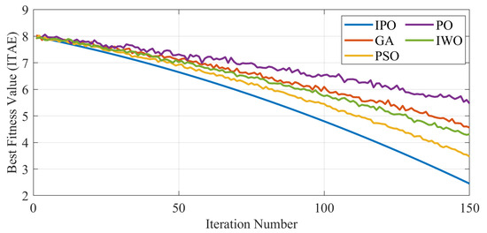 The objective function was the ITAE, which indicates dynamic environmental variations, such as temperature changes and sunlight intensity variations, for control performance in both transients and steady states. Each algorithm was run for 150 iterations with similar initial bounds for . All simulations were executed 30 times to ensure statistical relevance. Figure 9 exhibits the convergence particularity of each algorithm when the best fitness value (that is, ITAE) is plotted across iterations.