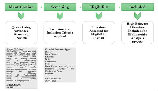 In the Identification phase, a comprehensive query was executed in the Scopus database using advanced Boolean search operators. The search targeted documents containing the following advanced query: TITLE-ABS-KEY (“Vertical axis wind turbine” OR “Vertical axis wind turbines” OR “VAWT”) AND TITLE-ABS-KEY (“urban wind energy” OR “floating offshore wind” OR “counter-rotating array” OR “distributed energy generation” OR “building integrated wind turbine” OR “hybrid energy system” OR “small scale” OR microgeneration OR “water pumping” OR “emergency power” OR “backup power” OR “meteorological station” OR “telecommunication station” OR “electric mobility” OR “charging station”). This yielded an initial set of 538 documents.
