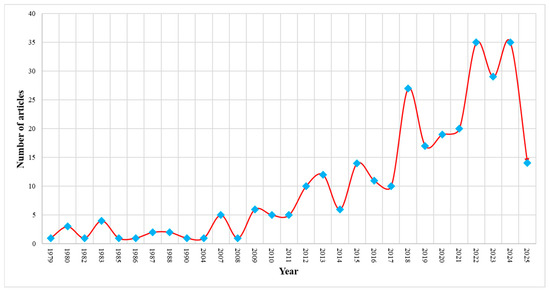 Annual scientific production between 1979 and 2025.