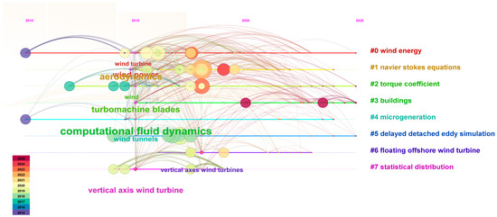 Figure 3 illustrates the temporal evolution of research themes in the field of vertical-axis wind turbines (VAWTs) and related domains between 2010 and 2025. Each horizontal line corresponds to a thematic cluster labeled on the right, ranging from #0 to #7, and each cluster represents a distinct area of inquiry within the broader wind energy research landscape. The size of the nodes (circles) indicates the frequency or importance of keywords or references, while the color of the nodes follows a temporal gradient: blue tones indicate older studies (around 2016), while yellow-to-dark-red nodes represent more recent activity (2023–2025). In this network visualization created using VOSviewer 1.16.18, the minimum frequency threshold for keywords was set to four occurrences. This means that only terms appearing at least four times in the dataset are included in the thematic clusters shown in Figure 3. This filtering ensures that the visualization highlights the most significant and recurring research themes while minimizing the noise from less frequent keywords. This enables the visualization of how scientific interest has shifted over time across different subfields.