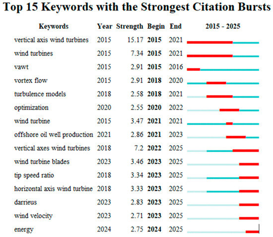 Figure 4 presents a citation burst analysis of the top 15 keywords most intensively cited in the field of wind energy research between 2015 and 2025. A citation burst indicates a period in which a keyword experienced a sudden and significant increase in citations, signaling emerging trends or shifts in scientific focus. The end of the burst period suggests that while the initial surge of interest reached its peak, the topic has since become integrated into broader discussions and developments in the field of wind energy technologies. The keyword “vertical axis wind turbines” stands out with the highest burst strength (15.17), active from 2015 to 2021, confirming the strong interest in VAWTs during this period, likely driven by their potential for urban energy systems and decentralized applications. Similarly, general terms such as “wind turbines” and “wind turbine” also show notable bursts starting in 2015 and 2021, respectively, reflecting consistent attention to turbine technologies throughout the decade.