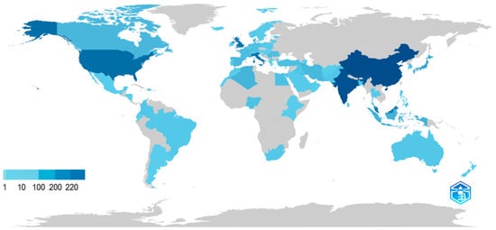Figure 5 illustrates the global distribution of scientific production related to VAWT-related publications, where countries are shaded in varying intensities of blue based on their frequency of scientific output—darker shades representing higher productivity. In bibliometric terms, the frequency refers to the number of scientific documents (e.g., journal articles and conference papers) attributed to authors or institutions from each country. Based on regional grouping, the Asia–Pacific region leads with 37.1% of the total publications (710 documents), primarily from China (220) and India (211). Europe follows with 25.2% (483 documents), with major contributors including Italy, the UK, and Germany. North America accounts for 10.5% (201 documents), led by the USA and Canada. Latin America contributes 1.8% (35 documents), represented mainly by Brazil and Mexico. The Middle East and North Africa region represents 6.0% (115 documents), while Sub-Saharan Africa contributes only 2.0% (38 documents). An additional 17.3% (332 documents) of publications come from countries not included in these regional classifications. This map visually highlights a strong imbalance in research output, emphasizing the need to foster greater academic collaboration and capacity building in underrepresented regions like Latin America and Africa.