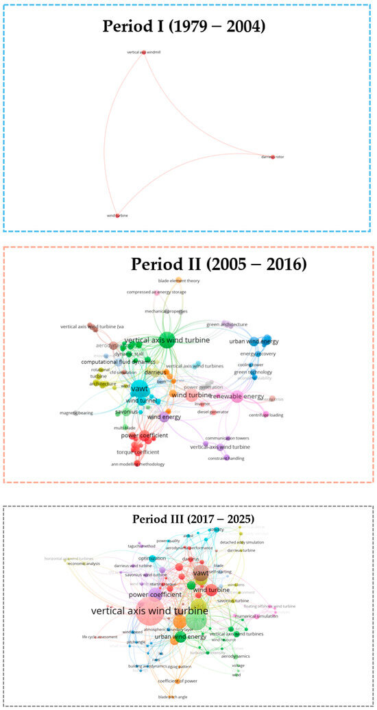 The analysis of the research network was divided into three distinct periods (as shown in Figure 6): Period I (1979–2004), Period II (2005–2016), and Period III (2017–2025).