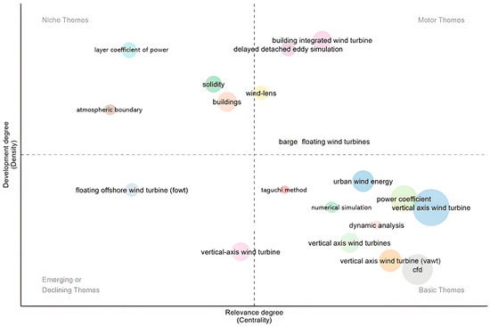 Niche themes (top left): Topics in this quadrant show high density but low centrality, indicating that while they are internally well-developed, they have limited connections to other topics in the field. Terms such as “atmospheric boundary layer”, “solidity”, “buildings”, and “coefficient of power” are located here. These may represent highly specialized or technical subfields that, although not central to the broader scientific discourse on VAWTs, contribute depth and specificity to particular knowledge niches.