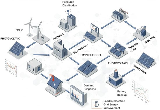 Although recent studies have addressed robust optimization under uncertainty [5], agent-based control mechanisms [16], and heuristic or learning-based approaches for smart grids [3,6], none have proposed a unified architecture that simultaneously captures structural interdependencies via bipartite networks and solves the energy distribution problem using classical linear programming. In particular, the existing literature often focuses on algorithmic performance without an explicit representation of connectivity constraints between heterogeneous energy nodes and end-user loads. The methodology introduced herein not only fills this gap but also demonstrates practical feasibility through a set of high-resolution simulations and scenario-based analyses. These include both market-influenced and market-agnostic operational regimes, allowing a comparative evaluation of demand response strategies under variable pricing, resource saturation, and load prioritization. This comprehensive evaluation aligns with current efforts in the literature that call for greater integration of communication technologies, optimization, and system-level modeling in the context of decentralized energy systems [17,18].