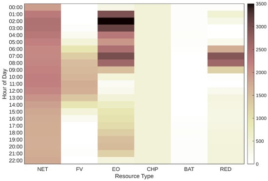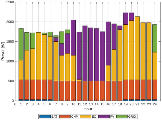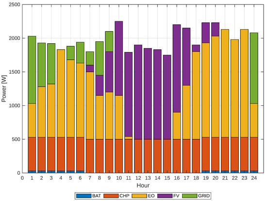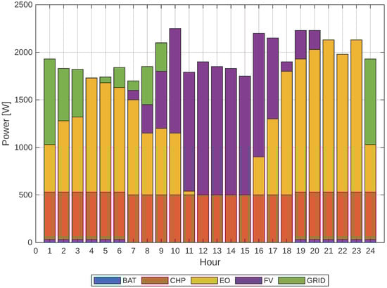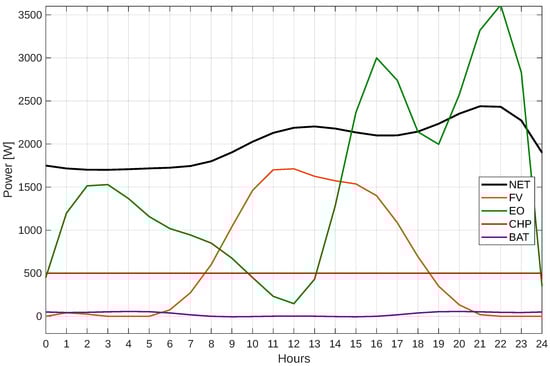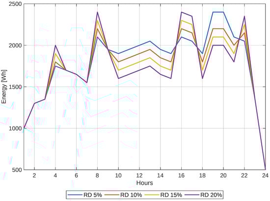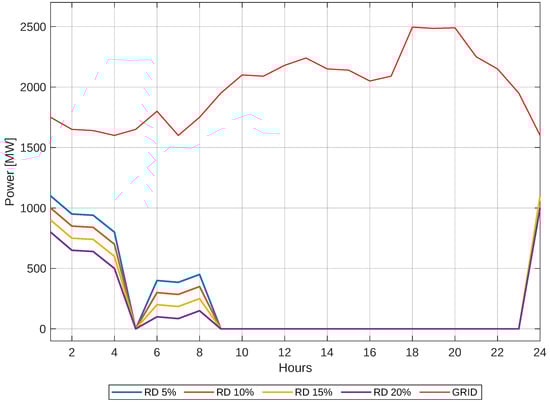 Finally, given the previous cases, it can be observed that the share of the grid decreases as the response to demand increases. The solution with a 20% demand response is shown in Figure 15. It is essential to understand how far our solution deviates from the typical demand curve, specifically whether we will be drawing power from the external grid or not, and whether the implemented model is optimal. Therefore, the comparison described above is presented in Figure 16.