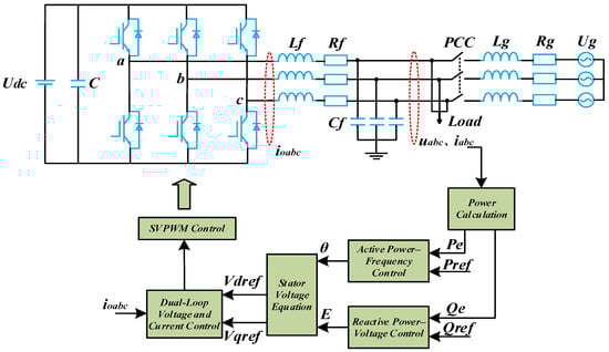 As illustrated in Figure 1, Udc and Ug denote the DC bus voltage and grid-side voltages, respectively, while uabc and iabc represent the inverter’s three-phase output voltage and current. ioabc denotes the current through the filter inductors. Rf, Lf, and Cf correspond to the parasitic resistance of the inverter-side inductor, the filter inductance, and the filter capacitance, respectively. Rg and Lg represent the equivalent resistance and inductance on the grid side. Pref and Qref are the reference values for active and reactive power, respectively. “PCC” denotes the point of common coupling, while θ and E represent the output phase angle and voltage amplitude of the VSG.