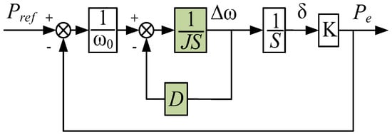 where δ is the power angle of the VSG; Ug and X represent the grid voltage amplitude and the equivalent line reactance, respectively; and K = 1.5 UgE/X denotes the synchronous voltage coefficient. As illustrated in Figure 2, the equivalent closed-loop control block diagram for the grid-connected active power of the VSG can be derived from the above analysis [22].