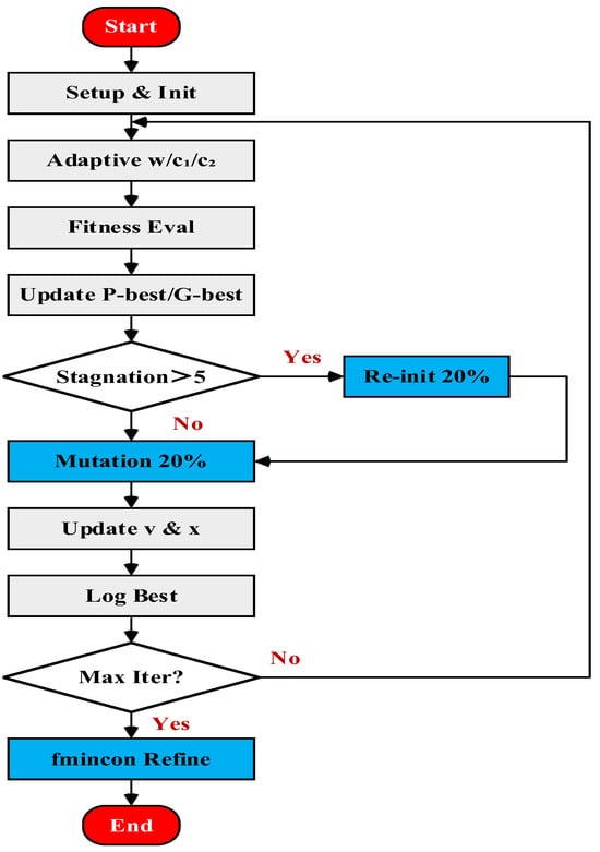 To address these issues, this study proposes an enhanced PSO algorithm based on the standard PSO framework. The optimization flowchart of the proposed algorithm is illustrated in Figure 3. Compared to the standard PSO, the proposed algorithm incorporates dynamically adjusted inertia weights and learning factors, random reinitialization in case of stagnation, and local refinement strategies. These enhancements synergistically improve convergence speed, maintain population diversity, and enhance solution accuracy.
